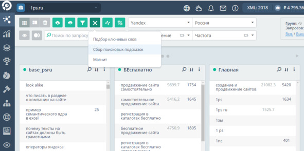 5. Топвизор – платный сервис поисковой аналитики. Перейдите на страницу «Ядро», нажмите на панели инструментов «Подбор ключевых слов» и выберите «Сбор поисковых подсказок»