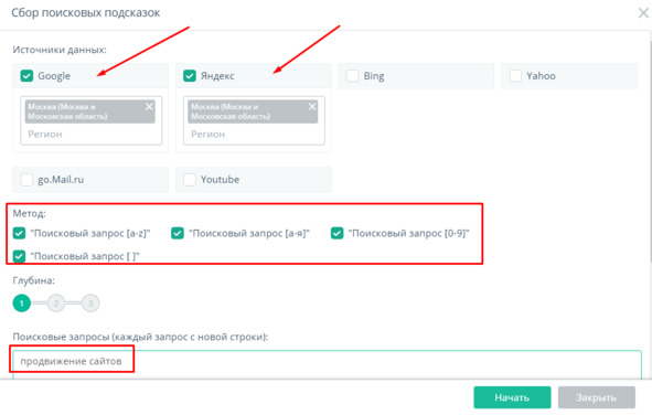 Далее указываете поисковую систему (Яндекс, Google, go.Mail.ru, Спутник, Bing и Yahoo) и регион для сбора подсказок. Выбираете метод ([a-z], [а-я], [0—9] и []) и глубину сбора, вводите запросы и нажимаете «Начать»: