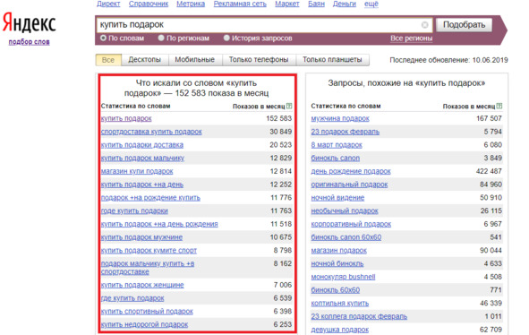 Уточнённые запросы – те, которые включают слово из вашего первичного запроса. Например, введя слово «купить подарок», вы обнаружите несколько сотен запросов с этим словом, которые на самом деле вводили пользователи за прошедший месяц: «купить подарок мальчику», «купить подарок на день рождения», «купить подарок мужчине» и т. д.