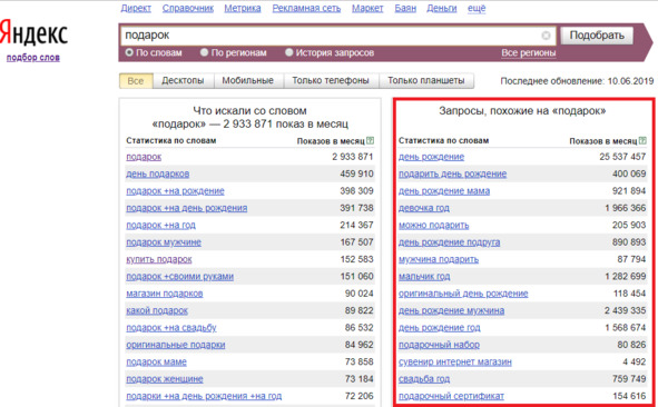 Ассоциативные запросы – те, которые пользователи вводили вместе с интересующим вас запросом. Например, пользователи, которые искали «подарок» вводили еще запросы: «подарить день рождение», «подарочный сертификат», «можно подарить», «подарочный набор» и т.д. Они тоже могут быть вам полезны.