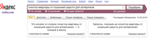 Помимо того, что вы соберете уточненные и ассоциативные запросы, с помощью сервисов по подбору семантического ядра, вы сможете определить «нулевые» запросы, то есть те, по которым пользователи не ищут информацию. Например, вдруг вы хотели включить в семантическое ядро очистку квартиры от кошачьей шерсти для аллергиков. Но, увы, пока на такую услугу спроса нет: