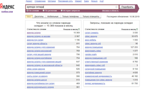 Проведя анализ фразы «Аренда склада», мы получили список из 474 уточнённых и 2 ассоциативных запросов.