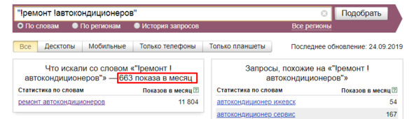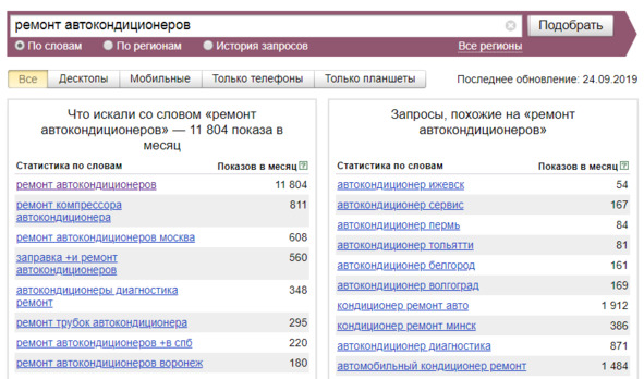 Например, вас интересует, сколько человек ищет «ремонт авто кондиционеров»: