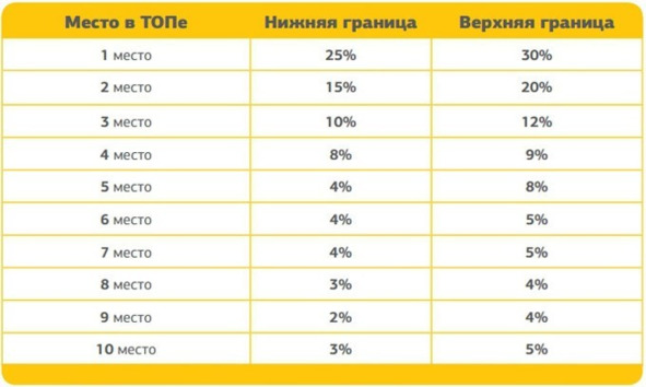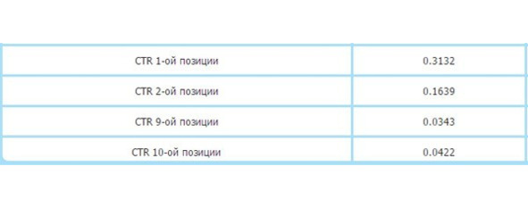 В своей работе мы ежедневно рассчитываем трафик при составлении сем. ядра. Регулярный анализ трафика позволил составить нам свою таблицу коэффициента кликабельности сниппета (CTR) в зависимости от позиции сайта.
