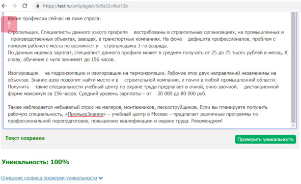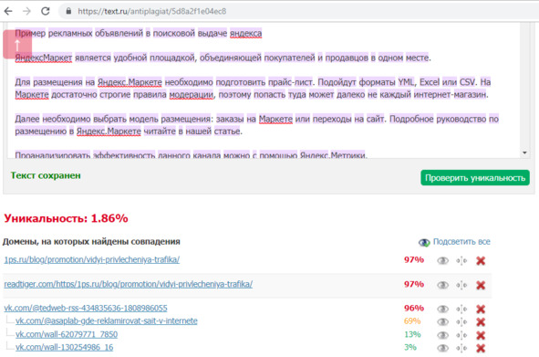 Не поленитесь проверить текст пару раз – лучше различными сервисами. Иногда показатели могут отличаться, и один раз вы увидите заветные 100%, а при следующей проверке будет уже 68%. В этом случае все проблемные места стоит довести до ума.