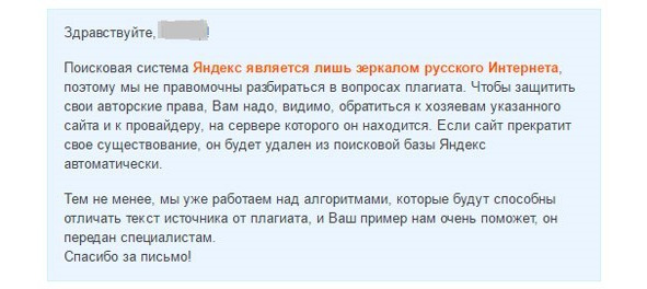 Рис.179. Ответ Яндекс. Вебмастера о ворованном контенте