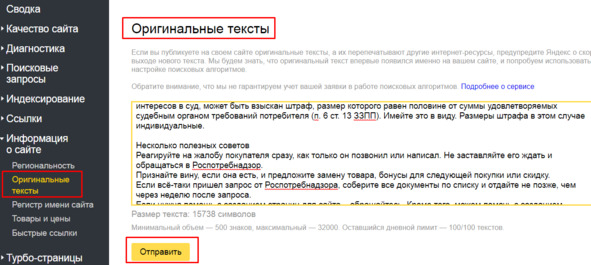 Воспользовавшись данным сервисом, вы защитите свои тексты от плагиата. Яндекс будет знать, что первоисточник текста – ваш сайт, и учтёт это.