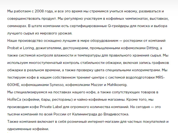 Далее рассмотрим отрывок уникального по смыслу и полезного для ЦА текста: четко прописано чем занимается компания, для каких предприятий осуществляются поставки, пояснем процесс производства и другие важные нюансы.