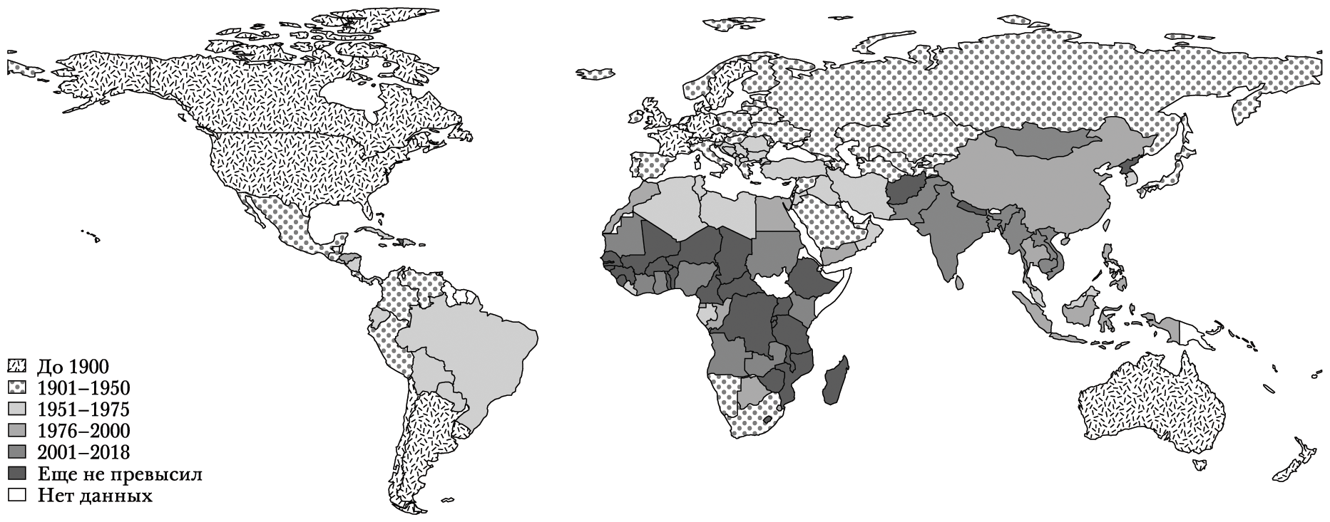 РИС. 1.4. Год, когда ВВП на душу населения превысил 10 долларов в день (в долларах США 2018 г.)