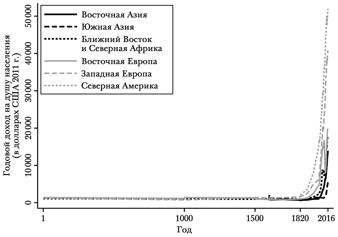 РИС. 1.5. Годовой доход на душу населения для некоторых регионов с 1 г. н. э. по настоящее время.