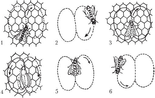 «Виляющий танец» сборщицы пыльцы: 1, 2, 3, 4, 5, 6 – последовательные стадии танца
