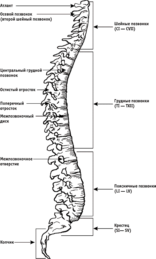 В шейном отделе насчитывается 7 позвонков (CI-CVII), в грудном – 12 (TI-TXII), в поясничном – 5 (LI–LV), в крестцовом – 5 позвонков (SI-SV), сросшихся воедино. Кроме того, есть также от 3 до 5 маленьких позвонков в копчике (рис. 1).