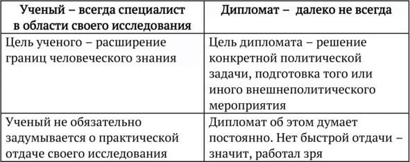 Определяя качества, присущие дипломату, следует четко представлять себе, чем они отличаются от качеств ученых, «доцентов с кандидатами». И те, и другие собирают фактический материал, изучают его, делают выводы. Третий или второй секретарь в посольстве готовит информационные документы, сотрудник научного института – статьи или монографии, студент Дипломатической академии, МГИМО или факультетов международных отношений других вузов – курсовые и выпускные квалификационные работы. В чем разница? Кое-что должно стать понятным из ниже приведенной таблицы: