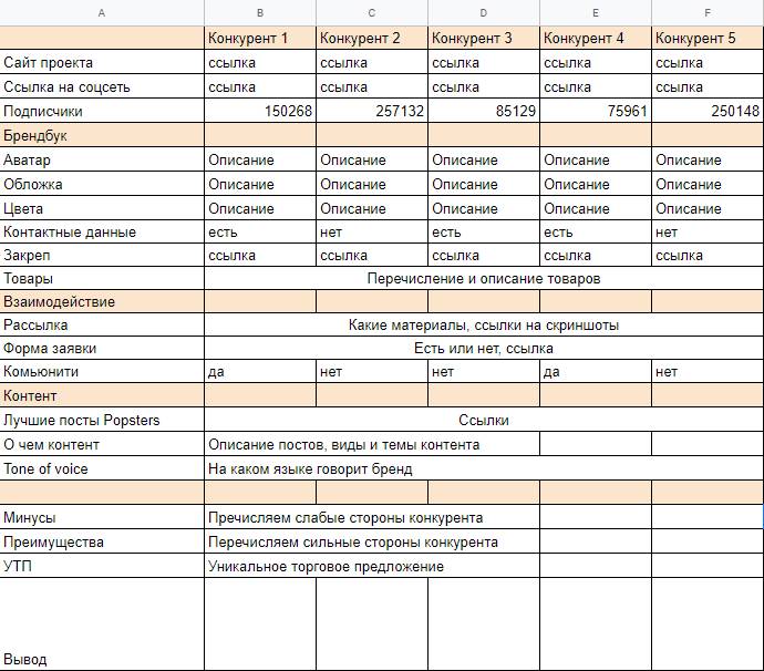 Анализ конкурентов – это по сути анализ ниши в соцсетях. С помощью него вы сможете понять, в чем сила лидеров, в каких соцсетях они продвигаются, какие инструменты применяют, на что делают упор и к каким показателям стоит стремиться. Анализ конкурентов также проводится совместно с владельцем бизнеса, маркетологом и SMM-специалистом.