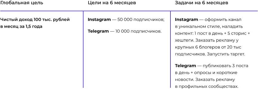 Примерный план целей и задач на 6 месяцев: