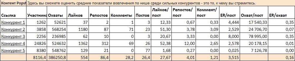 В таблице видим, что средний ER по сильным конкурентам очень низкий – 0,16 %. Можно сделать вывод, что либо социальными сетями в вашей нише занимаются плохо, либо аудиторию очень сложно привлечь в сообщества вашей темы – скорее всего, подписчик будет дорогим. Понять, что это значит, можно только после этапа тестирования (см. главу «Таргетированная реклама»).