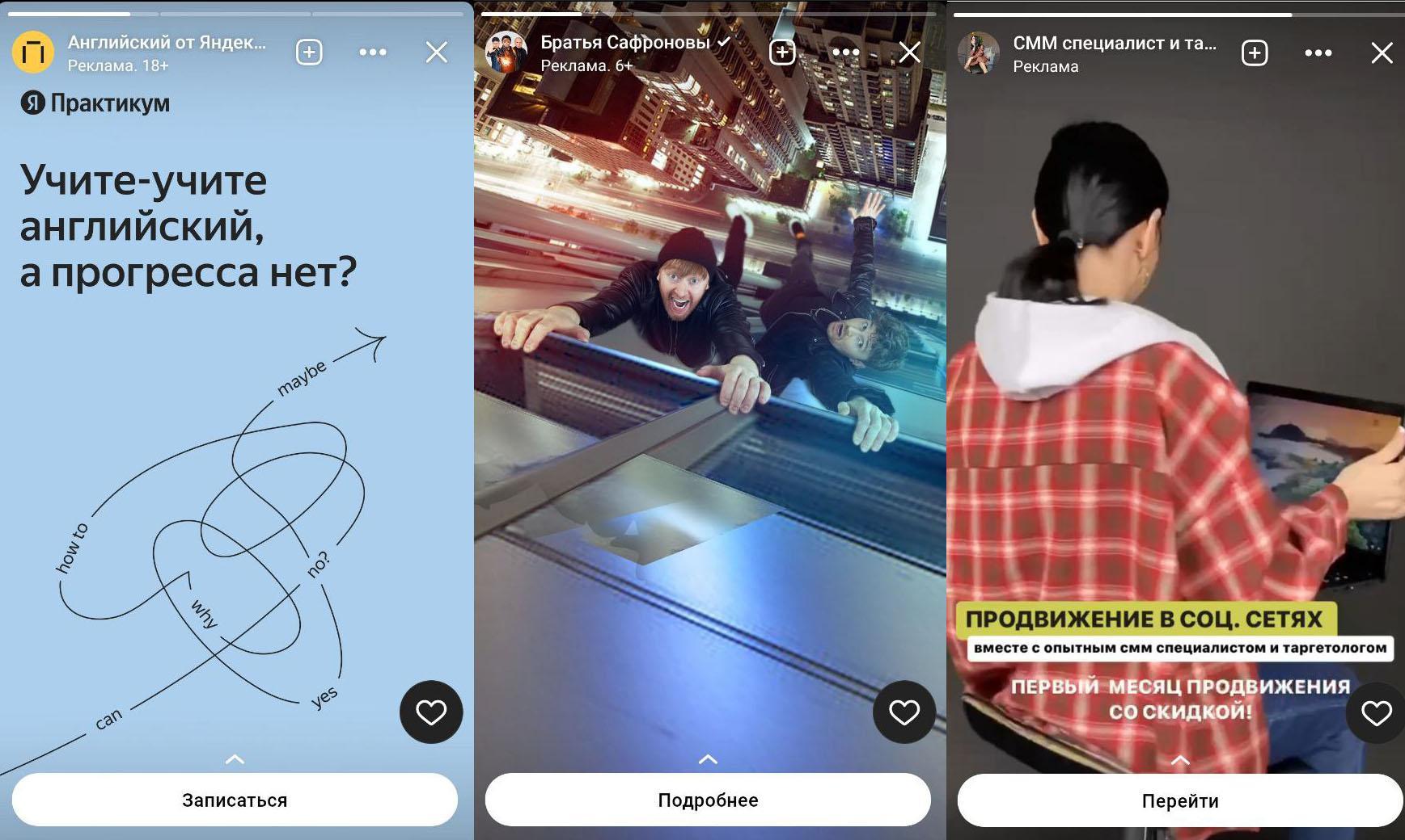 Вот пример рекламы в Историях ВКонтакте, которая находит меня. Все были пойманы за 15 минут просмотра. Их объединяет общий подход: ссылка на подробную информацию о проекте