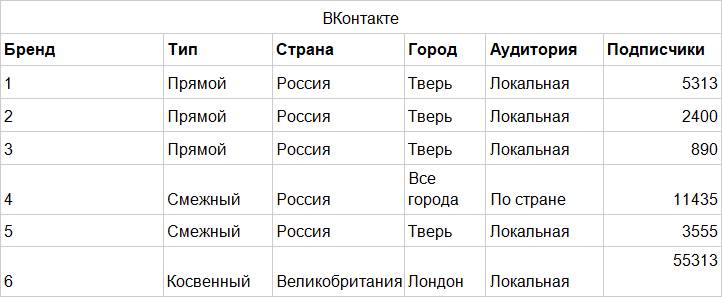 Для каждой соцсети составляется отдельная таблица. Чем больше найденных конкурентов – тем лучше! В нашем же примере их немного: первые три – это барбершопы, который расположены в одном городе, четвертый и пятый – магазины профессионального оборудования, а шестой – барбершоп из Лондона.