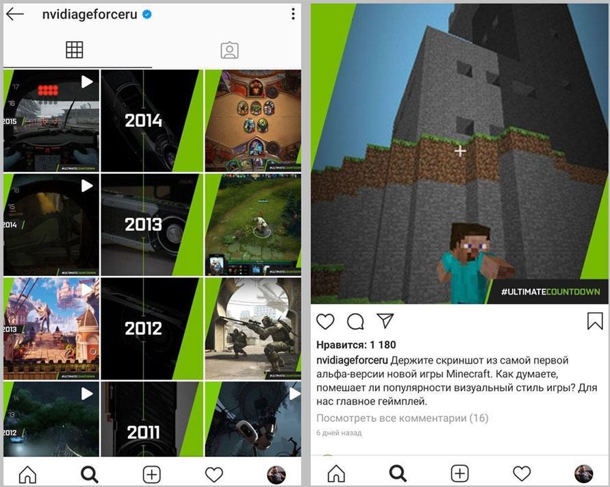 Сперва создаются рубрики. Они нужны для упорядочивания информации, отслеживания эффективности контента и структурирования ленты. Для каждой сферы – свои рубрики. Например, в своем аккаунте производитель видеокарт Nvidia прекрасно адаптировал рубрику «История компании», назвав ее Ultimate Countdown. SMM-щик разбил хронологию по годам и в трех постах успевает презентовать продукт (видеокарту бренда) и рассказать про культовые игры того времени.