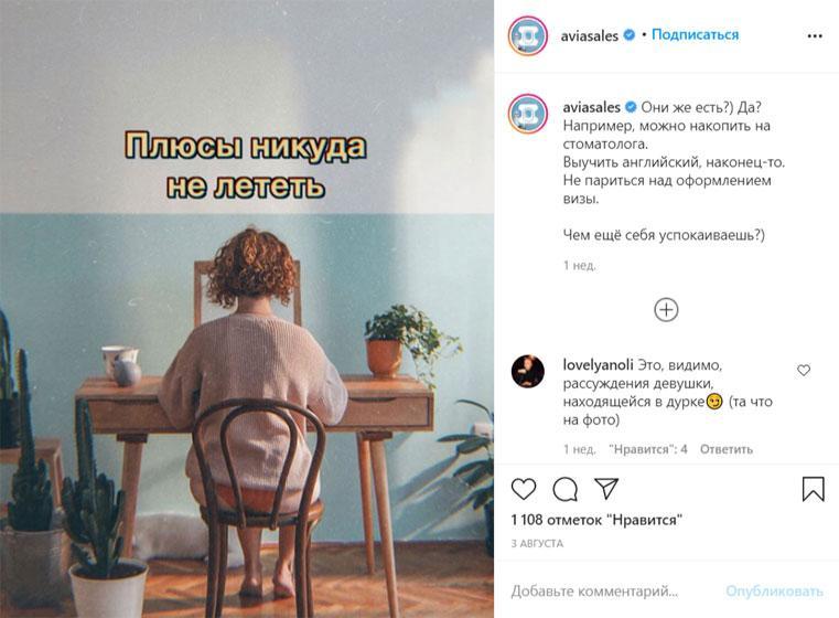 Актуальная тема (пандемия и закрытые границы) и неожиданная подача от Aviasales дают результат – тысяча лайков и сотня комментариев
