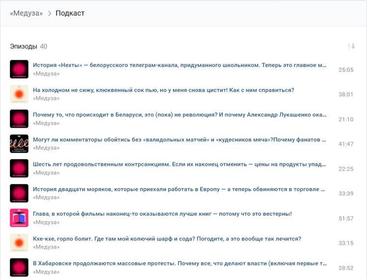 Подкасты. Подкасты существуют давно, но только-только набирают обороты как формат и все еще редко встречаются на аккаунтах в соцсетях брендов. И если в Фейсбуке*, Инстаграме* и Твиттер все еще нет такой функции, то ВКонтакте еще в январе 2019 года добавил внутренний функционал для их размещения в соцсети. Подкасты отлично подходят для медиа. Например, Медуза ведет сразу несколько рубрик: начиная от новостей и заканчивая историческими темами, книгами и поп-культурой.