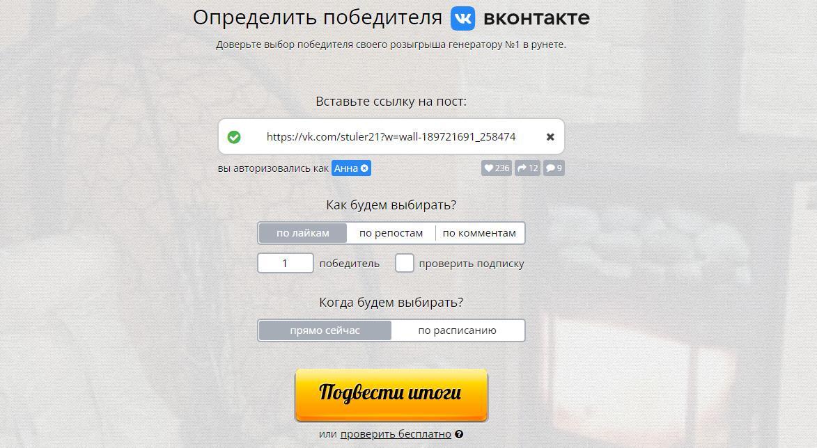• Генераторы случайных чисел – выбирают одного или нескольких победителей по комментариям, лайкам, репостам, хештегам, упоминаниям, геометкам. Некоторые инструменты могут сразу проверять победителей на подписку, регион и другие параметры, которые вы установили в качестве требований.