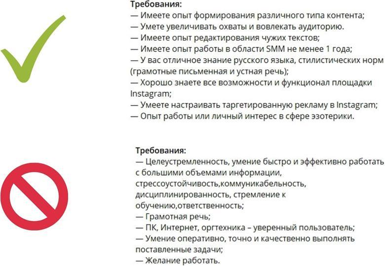 Обязанности. Пример А расписывает задачи SMM-специалиста: нужно делать контент для ленты и сторис, продумать стратегию рекламы через блогеров и поработать с визуалом. Пример Б размыт: нужно создавать какие-то страницы, рассылать сообщения в соцсетях и вести отчетность. Похоже на спам:-)