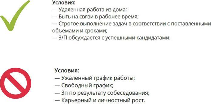 Условия. Пример А требует удаленку и строгое выполнение задач. Пример Б мало того, что написан с ошибкой («ужаленный график»), так еще и допускает размытую формулировку «карьерный и личностный рост».