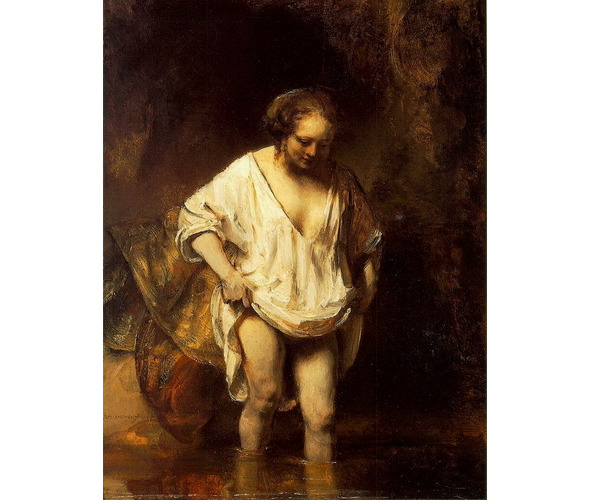 Это Хендрикье Стоффельс. Вторая жена Рембрандта, вошедшая в его дом через семь лет после смерти любимой Саскии. О судьбе её чуть позже…, а сейчас она переходит ручей, бесстыдно высоко подняв тонкую сорочку, обнажив бедра и колени зрелой женщины, практически открыв грудь в глубоком декольте и не замечая, что ей любуется мужской взгляд. Причем любуется именно ей, такой, как она есть.