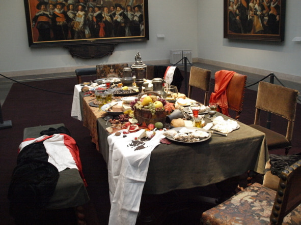 Это фотография из Харлемского музея Хальса с серией таких застольных коллективных портретов. А ниже остроумная современная инсталляция музейщиков на тему: «После банкета офицеров роты святого Георгия»
