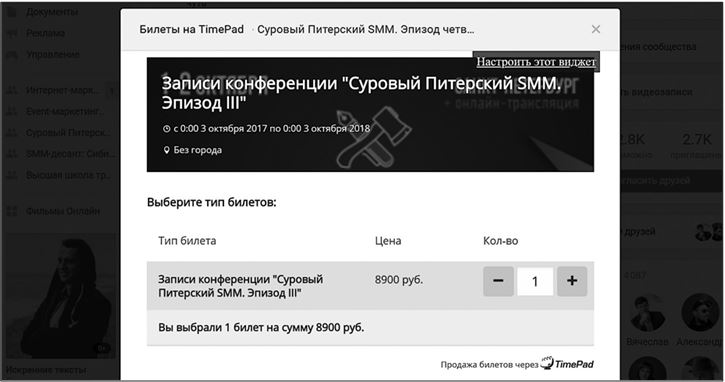 Эти приложения чаще всего встраиваются в формат встреч, который используется для рекламы мероприятий. Через них идет непосредственная продажа билетов. На данный момент самые известные – это «Билеты на TimePad», «Qtickets – продажа билетов», «Купить билет» от сервиса Radario. Все эти приложения являются дублем функций основных платформ. Например, TimePad выглядит так (рис. 3).