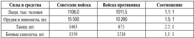 Всего три советских фронта насчитывали 10 общевойсковых, танковую и 4 воздушные армии, 5 танковых, 2 механизированных и 3 кавалерийских корпуса, 34 отдельные бригады (в том числе 15 танковых), 9 укрепленных районов и 5 отдельных танковых полков. В общей сложности в эту стратегическую группировку советских войск входило 66 стрелковых и 8 кавалерийских дивизий, 198 артиллерийских и минометных полков (из них 129 артиллерийских и минометных полков РВГК). С учетом отдельных стрелковых и мотострелковых бригад количество расчетных дивизий достигало 74,5.