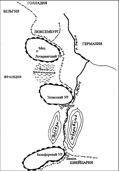 Сама линия Мажино состояла из нескольких укрепленных районов. Наиболее прочным из них был Лотарингский, или Мецский, укрепленный район, занимавший по фронту 120 километров. Передний край его был удален от границы на 10–15 километров.