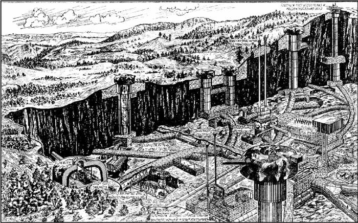 Под землей в «ансамбле» были оборудованы склады боеприпасов, жилье для гарнизона и все обслуживающие помещения. Эти помещения располагались на различных уровнях, образуя уступы. Общая глубина «ансамбля» доходила до 30 метров. Все его сооружения были соединены сетью подземных галерей, а входы в «ансамбль» тщательно замаскированы. Для затруднения распространения противника, проникшего в «ансамбль», при входе и в глубине была устроена сеть броневых дверей, закрывающихся автоматически. Общая площадь «ансамбля» доходила до 1 кв. километра.