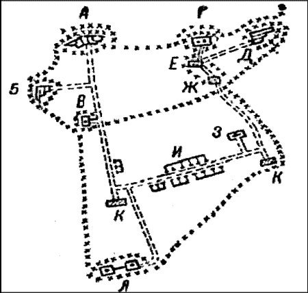 В общем, промежуточные укрепления и казематы образовывали оборонительную полосу глубиной 4–5 километров. При этом никаких особых центров сопротивления и опорных пунктов не создавалось. Но при этом требовалось, чтобы структура огня была минимально четырехслойная.