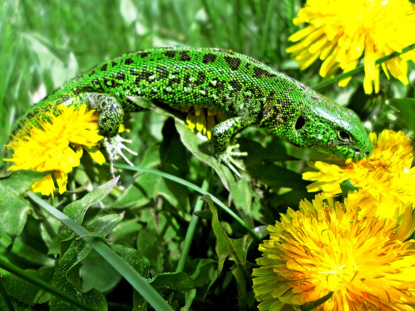 На зеленую лужайку выбежал проворный ящер. В пушистых желтых одуванчиках скопились капельки росы. Лимонад из одуванов! Ящер с наслаждением попил.