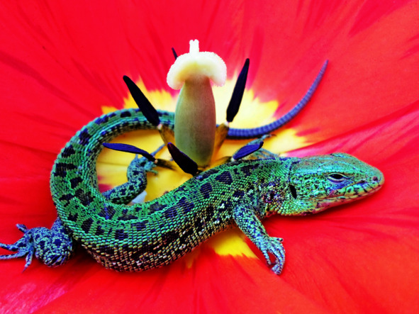 Забрался в самую середину большого красного цветка и затих среди пестиков и тычинок. Налетел ветер и раскачал бутон. Ящер тихонечко захихикал.