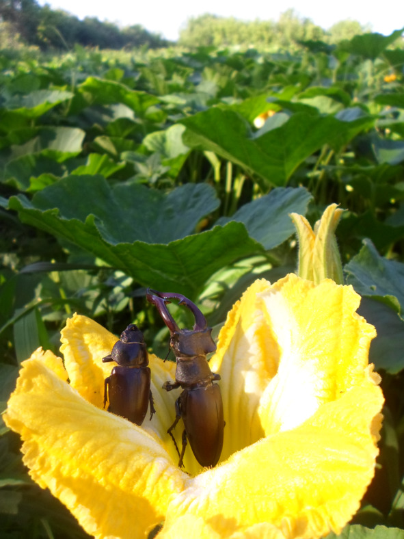 В самом красивом тыквенном цветке действительно свидание. Влюбленная парочка жуков оленей – молодой жук и юная жучиха.