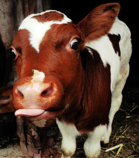 Теленок осторожно переминался с ноги на ногу, ведь котенок такой маленький. Потом нагнулся и облизал Хромыша с ног до головы.