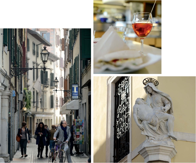 Dieser Einkaufstrend hat etwas abgenommen, bedingt durch die Verbesserung des heimischen Angebotes, sowohl was Mode als auch Kulinarik betrifft, aber auch durch das gestiegene Preisniveau in Italien, das sich zu unserem Leidwesen an unseres angeglichen hat. Außerdem machen sich die Shoppingmalls bemerkbar, die kaufwillige Besucher schon vor den Toren der Stadt abfangen. Ja, auch die City Udines hat so ihre Probleme, die durch die Wirtschaftskrise, in die Italien hineingeschlittert ist, nicht gerade weniger werden. Wer trotz der Versuchungen der glitzernden Einkaufswelten bis in die Altstadt vordringt, wird aber kaum etwas von dieser Krise bemerken: Dem Charme der exquisit gestalteten Schaufenster in den kleinen Gassen und unter Arkadengängen haben Shoppingcenters nichts entgegenzusetzen. Wie eh und je hängen die Udineser leidenschaftlich und in Trauben vor den Bars, Cafés und Enotheken und lassen sich ihren Tajut – oder vermehrt Prosecco und Aperol Spritz – schmecken, als gäbe es kein Morgen. Die Gassen summen vor Geschäftigkeit, und dass sich die Städter hauptsächlich auf umweltschonenden Fahrrädern fortbewegen, so lange es das Wetter irgendwie zulässt, hat weniger mit Ökologie oder mit der Geldbörse zu tun, als einfach damit, dass man derart schnell und bequem ans Ziel kommt.
