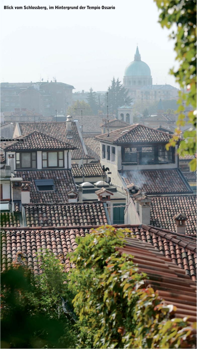 Das landschaftliche Herz der Stadt, den Schlossberg, gibt es wohl schon seit der Eiszeit, denn er ist das Überbleibsel einer Endmoräne, aufgehäuft aus Fluss- und Gletscherkonglomeraten. Die Sage hält allerdings eine weitaus spektakulärere Erklärung bereit: Danach ist diese so seltsam allein dastehende Erhebung durch die Hunnen entstanden, die 452 das Land überrannt und das legendäre Aquileia im Süden der Ebene in zerstört hatten. Waren die gnadenlosen Krieger der Hunnen normalerweise für ihr effizientes Zerstörungswerk bekannt, so sollen sie hier ihre Kräfte aufgewendet haben, um etwas Neues aus dem Nichts zu schaffen – nämlich den 156 Meter hohen Hügel –, und zwar indem sie in mühsamer Kleinarbeit Erde mit ihren Helmen aufschütteten, bis der Hügel hoch genug war, um Hunnenkönig Attila von der Spitze aus einen triumphalen Blick auf seine letzte Heldentat zu bieten: das ferne Aquileia in Rauch und Asche.