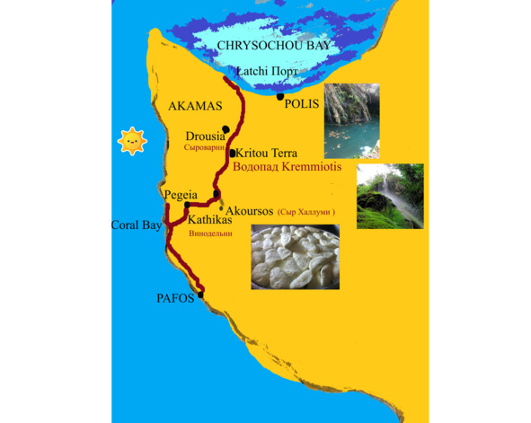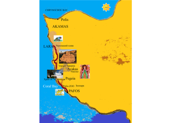 Примечание: указатель Akoursos 7 km также есть на прибрежной дороге Пафоса, до поворота на курорт Корал-Бэй (Coral Bay).