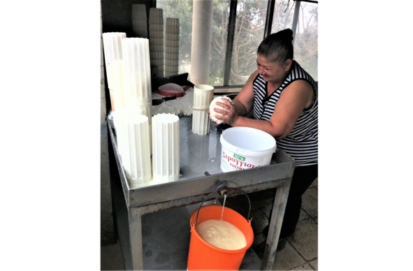и другой молочной продукцией, которой славится деревня. Готовят её в нескольких домах, но мы, предварительно позвонив по телефону +357 99401563, посетим домашнее молочное производство, или «галактокомио» по-гречески, с вывеской «Laona» у дома 3 на улице Ag. Marinas. Две хозяйки киприотки Ангела и Марина готовят здесь сыр халлуми, анари, флауна, йогурт и другие продукты из овечьего и козьего молока. На столике у производственного цеха размещена информация про халитзи (н) /халитзья (греч. το χαλίτζιν, τα χαλίτζια), как его называют на Кипре. Однако, кроме округа Лаоны и Полиса, вряд ли найдутся даже киприоты, знакомые с этим мягким белым сыром с дырками и кислым вкусом. Халитзин напоминает по вкусу греческий сыр фета, хотя его вкус более кислый, чем фета, а его состав больше похож на кипрский халлуми.