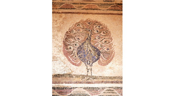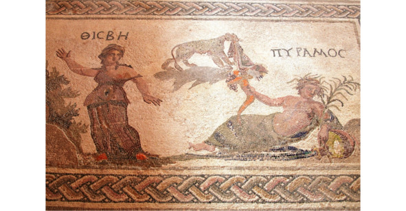 В центре мозаики в зале 15 – изображение павлина. Птица стоит прямо, на полосе земли, на светлом фоне, подчёркивающем насыщенный цвет его полностью распущенного хвоста. Вся панель обрамлена лентой гильоша. Наконец, ниже панели «Триумф Диониса» в зале 16 находятся четыре мозаики со знаменитыми мифологическими сюжетами. «Пирам и Фисба», увековеченный Овидием, – сюжет первой мозаики. Самый прекрасный юноша по имени Пирам и его любимая девушка Фисба стали античными прообразами Ромео и Джульетты. Овидий рассказывает, что жили они в Вавилоне и были соседями. Их семьи враждовали между собой и не разрешали влюблённым встречаться. Несмотря на запрет родителей, юноша и девушка беседовали через щель в стене, разделявшей их дома. Однажды они условились о тайной встрече за городскими воротами, под шелковицей. Фисба пришла первой, но, пока она дожидалась Пирама, появилась львица с кровавыми клыками, только что терзавшая быков. Испугавшись, Фисба спряталась в пещере, но на бегу обронила свою вуаль, которую львица разорвала кровавой пастью. Когда Пирам пришёл и увидел звериные следы, а затем окровавленную вуаль, он представил себе самое худшее. Решив, что Фисба погибла, и не представляя жизни без неё, он вонзил в себя меч. Его брызнувшая кровь навсегда обагрила ягоды шелковицы. Вернувшись, Фисба нашла умирающего любимого и убила себя тем же мечом, желая, чтобы похоронили их в одной гробнице, и чтобы шелковица приносила плоды тёмного скорбного оттенка в память об их несчастной любви. И действительно, согласно Овидию, прах двух влюблённых покоится вместе, а ягоды шелковицы с тех пор всегда, созревая, приобретают тёмно-пурпурный цвет.