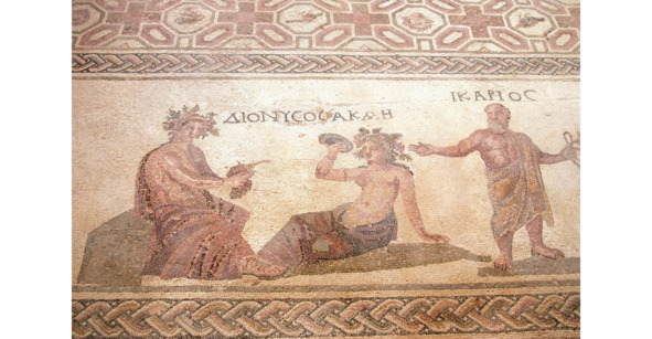 Он также предупредил Икара о беде, которая настигнет его и его семью, если он не спрячет вино. Несмотря на предупреждение, изготовив вино, Икар угостил им пастухов. Не знавшие прежде действия вина пастухи решили, что Икар отравил их, и убили его. По всей видимости, эта грустная история была избрана для мозаики, расположенной прямо перед входом в зал, намеренно из-за своей морали об умеренности в потреблении вина. Сцена на мозаике – это момент перед трагедией. Икар держит поводья повозки с быками, гружённой шкурами с вином. Справа, обозначенные в надписи как «первые искусители вина», – двое мужчин. Один из них лежит на земле, прислонившись к шкуре с вином. Второй, пока на ногах, пытается пить вино из чаши. Слева Дионис с кистью винограда в руках сидит на скамье. Судя по всему, он предлагает её нимфе Акме (не очень известному мифическому персонажу), пьющей вино из кубка. Надпись «ΑΚΜΗ» на мозаике удостоверяет этого персонажа. Присутствие её не случайно и символично, по-гречески это имя означает расцвет жизни (обычно возраста), зрелость и полноту сил. Если это так, то она должна обозначать душевное состояние, вызванное умеренным употреблением вина. Несомненно, Икар указывает на Акме в довольно многозначительной манере. Два пьяных пастуха, надо быть, символизируют беды от чрезмерного употребления вина. Конечно, это только гипотеза исследователей, но трудно избежать такой интерпретации мозаичного пола, находящегося на пути в столовую.