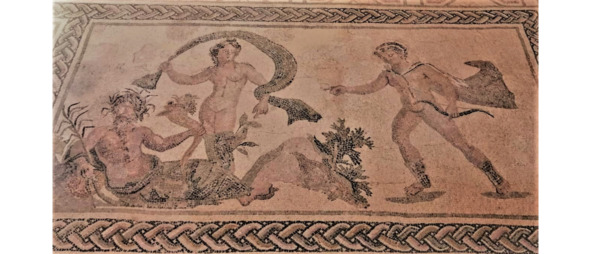 «Посейдон и Амимона» – сюжет следующей мозаики без надписей. В общих чертах миф таков: Посейдон разгневался на аргосцев за то, что они объявили свою землю принадлежащей не ему, а Гере. За это он высушил все водоёмы в Арголиде. Данай отправил на поиски воды 50 своих дочерей, одной из которых была Амимона, посоветовав им сделать всё возможное для смягчения гнева бога. Во время поиска Амимона увидела оленя и прицелилась в него из лука. Но она промахнулась, и стрела упала рядом со спящим сатиром. Сатир, увидев прекрасную девушку, попытался овладеть ею. Неожиданно появившийся Посейдон отогнал сатира своим трезубцем. Красавица Амимона сразу понравилась богу морей и, вспомнив наказ отца, с радостью разделила с ним ложе. В благодарность Посейдон ударом своего трезубца выбил из скалы источник Лерны, навсегда положив конец засухе. В левой части нашей мозаики изображён Посейдон с трезубцем в руке, шагающий навстречу Амимоне. Над Посейдоном и Амимоной парит Купидон с факелом в правой руке и с прямоугольным зонтиком в левой, он протягивает его Амимоне. На переднем плане изображён металлический кувшин как напоминание о том, что стало причиной странствий Амимоны.