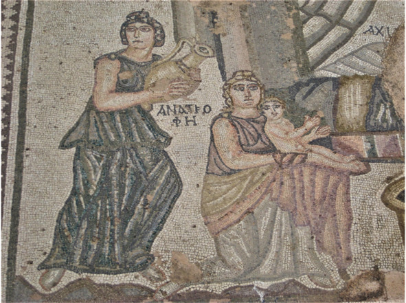На мозаике в Пафосе изображены первые попытки Фетиды в соответствии с несколько иной версией мифа. Младенец Ахиллес на мозаике сидит на коленях у своей грубоватой няньки Анатрофы. Она собирается окунуть Ахиллеса в таз с водой рядом с ложем, где на толстой перине возлегает Фетида. Колонны и серо-белая занавеска указывают на то, что сцена происходит во дворце. Рядом с нянькой изображена женщина по имени Амброзия, несущая воду в золотом кувшине. На троне сидит царь Пелей в белой тунике и плотном плаще, лицом к жене. На его царское достоинство указывает белая лента на голове. В левой руке он держит жезл (скипетр). За троном Пелея стоят три мойры (Клото, Лахесис и Атропос) в длинных туниках и плащах, покрывающих их головы. Клото держит веретено и прялку, Лахесис – диптих, а Атропос – развёрнутый свиток, на котором начертана жизнь Ахиллеса. Тема первого купания новорождённого героя часто встречается в римском искусстве, например, на изображениях из жизни Диониса или Александра Великого. Однако на Пафосской мозаике она связывает миф об Ахиллесе с тщетными людскими попытками достичь бессмертия.