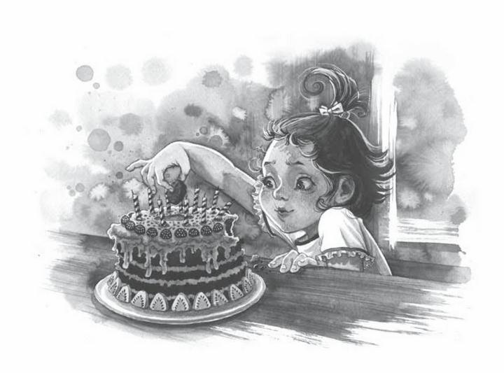 Пока никто за ней не следил, она умудрилась подкрасться к торту и откусить от него кусочек. На её щеках отпечатались два кремовых полукруга, а к носу прилипла шоколадная плямба.
