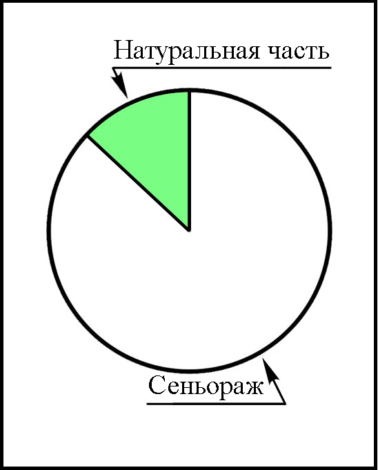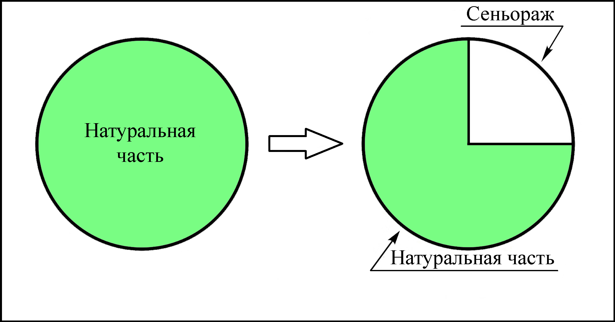 Таким образом, до появления в монете норматив-ной части (сеньоража) имел место натуральный обмен. После же появления в монете нормативной части она становится двухкомпонентной, соединяя в себе натуральную и нормативную составляющую. Из чего следует, что деньги являются производными власти и, как полюса магнита, власть и деньги неразделимы.