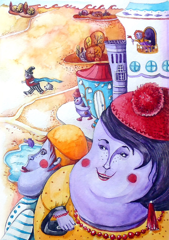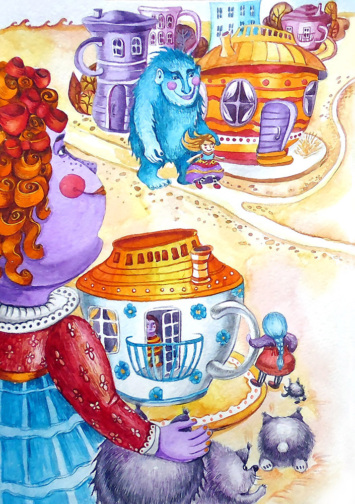 Наши герои двинулись в путь. Варе приходилось очень часто перебирать своими ножками, чтобы успевать за Бамарозом. Он шел быстро. Варя очень скоро увидела город. Город был прекрасен! Он сверкал на солнце хрусталем и металлом, переливался разноцветным перламутром и цветными орнаментами на площади и домах. В общем, это был очень красивый город! Только, через какое-то время девочка поняла, что он похож на огромный стол, на котором стоит посуда. Городская ратуша, громоздкая и величественная отливала золотым металлом и очень походила на самовар, даже краник имела ратуша и изогнутые ножки. Все это было внушительных размеров. Вдали виднелось большое здание в виде заварочного чайника с загнутым носиком. Над крышкой чайника с круглой фарфоровой ручкой из небольшой трубы поднимался дымок с цветочным ароматный, который нес ветерок прямо на Варю с Бамарозом. Вдоль улицы располагались домики – кружечки. Они стояли на блюдцах-подставках. Все кружечки и блюдца были разные, одни – в цветочек, другие – в кружочек, третьи, были расписаны бабочками или птицами. Богатство красок, узоров и форм кружило голову. В каждой чашечке было несколько круглых оконцев, полукруглая дверь со ступеньками и фарфоровая крыша с небольшой трубой. Все было сделано на совесть, все детали точно подогнаны друг к другу. Но кто это мог сделать, только какие-то гиганты? Гиганты, которым нравилось играть с фарфоровой посудой. Вокруг блюдец росли клумбы и ковром лежала трава.
